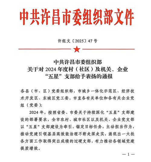近日,中共許昌市委組織部印發(fā)了《關(guān)于對2024年度村(社區(qū))及機(jī)關(guān)、企業(yè)“五星”支部給予表揚(yáng)的通報(bào)》,許昌市投資集團(tuán)黨委被繼續(xù)授予“五星”支部榮譽(yù)稱號,這是集團(tuán)黨委自2022年以來連續(xù)三年獲此殊榮。
